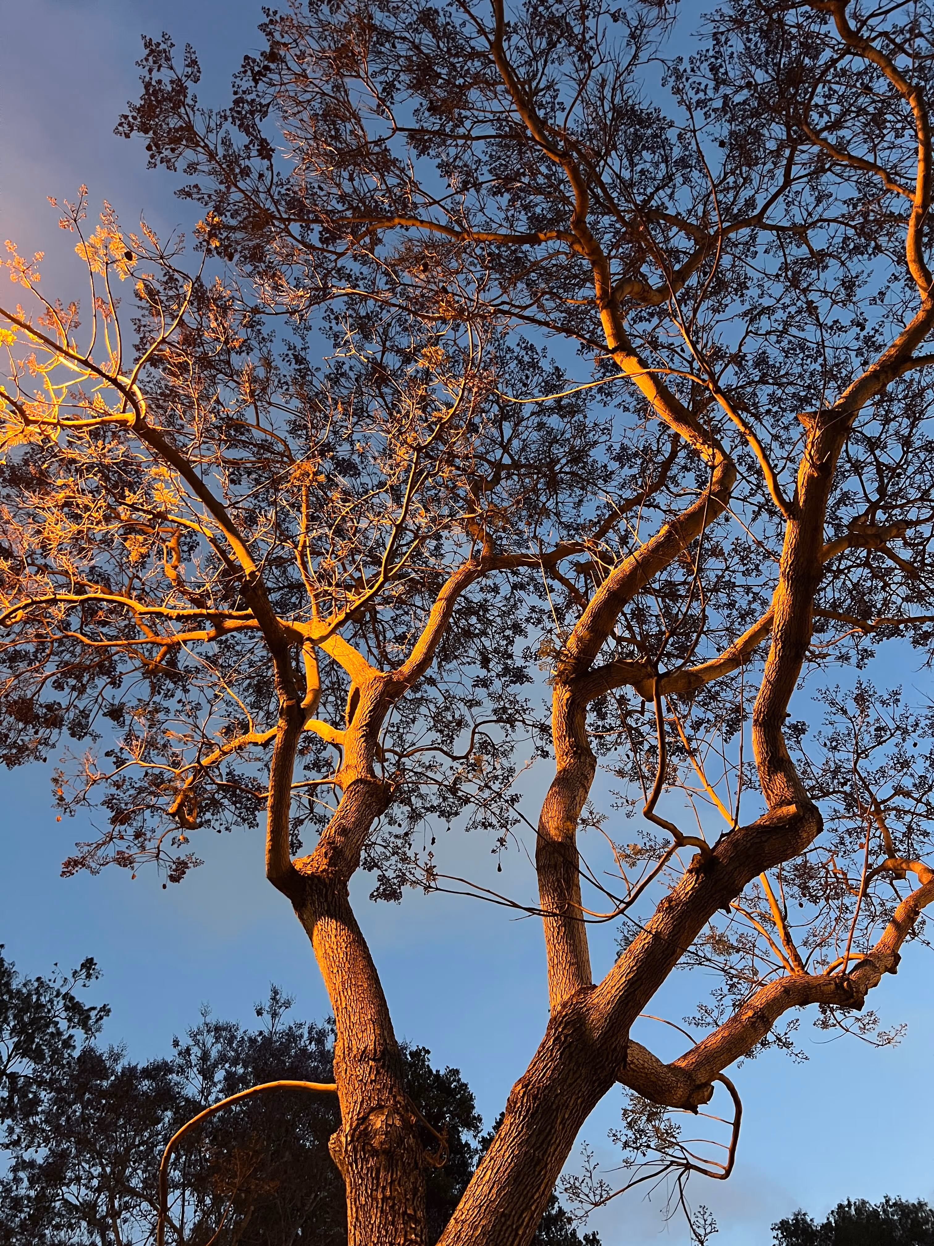 On the completed drawing, color the negative spaces between and around branches (use either colored pencil, marker, watercolor, or tempera), leaving the tree white, the color of the paper. Adding color will turn your drawing into “mixed media”, giving it a more refined appearance.